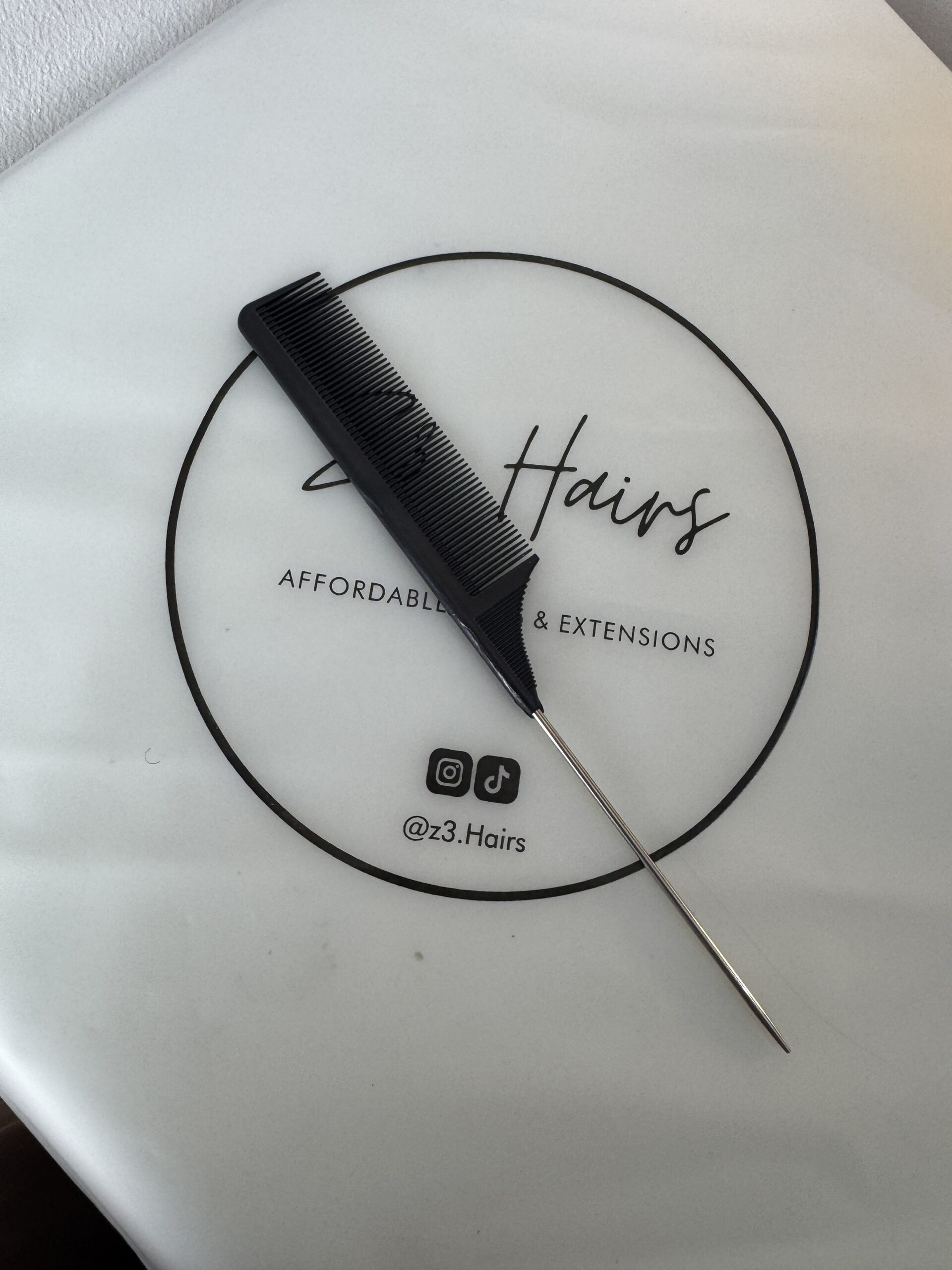 Professional rat tail comb designed for precise parting, sectioning, and styling. Features fine teeth for smooth detangling and a durable metal tail for accurate hair separation, making it ideal for braiding, weaving, coloring, and salon or home use.